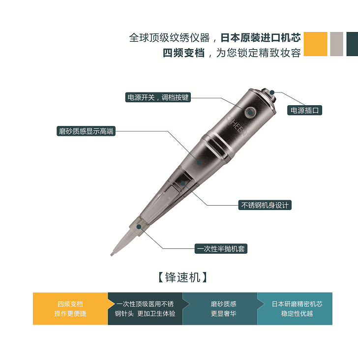 3、出针安稳及安全出针来判别纹绣机是否出针安稳,一般选用目测法;出针长度坚持一致,不能有忽长忽短的感觉,再将针套拔出,开机时出针是否在一条直线上(同款针),由于操作时线条的细腻、流转的程度是取决于纹绣机的稳定度的。假定针尖运转成扇形,说明出针不安稳,安全出针是指能把控针尖刺入皮肤的深度一致,避免纹绣师运用不妥将针尖过深刺入皮肤。什么纹绣机器好?纹绣机器在哪里买
