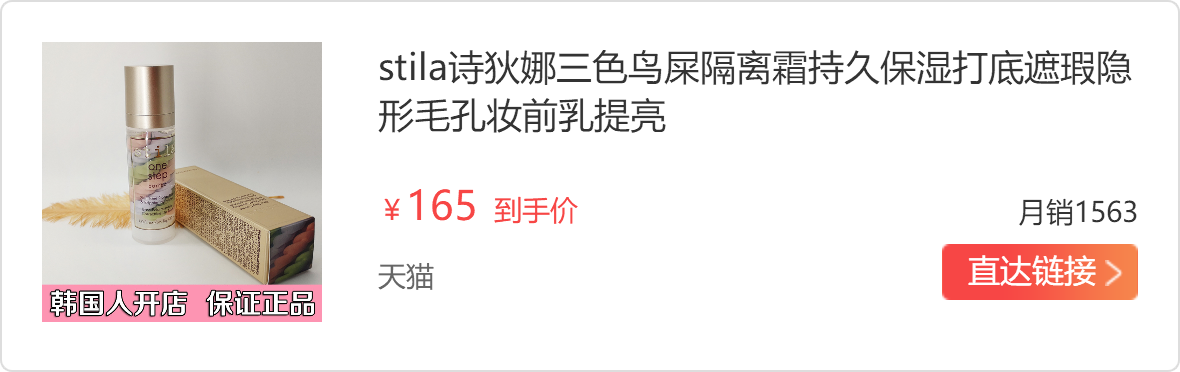 Stila的一步到位三色隔离在我用过的所有隔离里清爽度排不上第一也绝对在前三,加上它的价格,这就是我推荐它的原因。特别适合夏天,非常保湿,油皮涂后没有负担,也不闷痘,干皮上底妆也不搓泥。除了质地清爽,味道也没得挑,特别特别淡的味道,我个人觉得有一点点薄荷味道,所有人都能接受的那种。