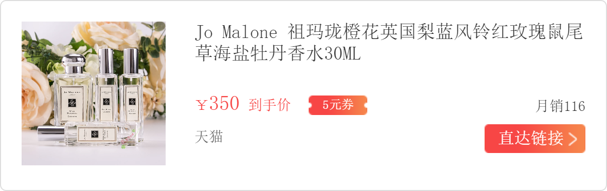 这只是妈妈去英国玩的时候买给我的。属于盲买,我个人对柑橘和鸢尾花的成分没抵抗力的,因为之前买过很多香水都有鸢尾花的香调,肯定不会踩雷。30ML,折合人民币大概是350左右。这只也属JO MALONE家的热门款。
