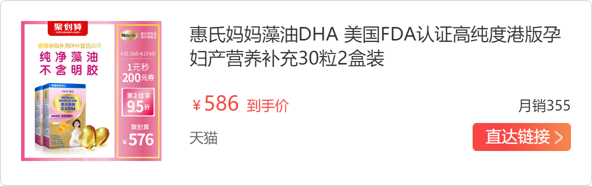 我问她从哪里买的?我也去买一瓶。闺蜜说是她老公去香港出差的时候买的,美国原装进口,经过FDA认证的,在香港很受欢迎呢,像我这样的孕期和哺乳期妈妈也都选择这个品牌。一瓶有30粒呢,一天一粒,够你吃一个月啦,每一粒都含200mg天然藻油DHA,足够你和宝宝的营养啦,下个月老公出差的时候再帮你带吧,哇,有个好闺蜜真的是很给力呀。