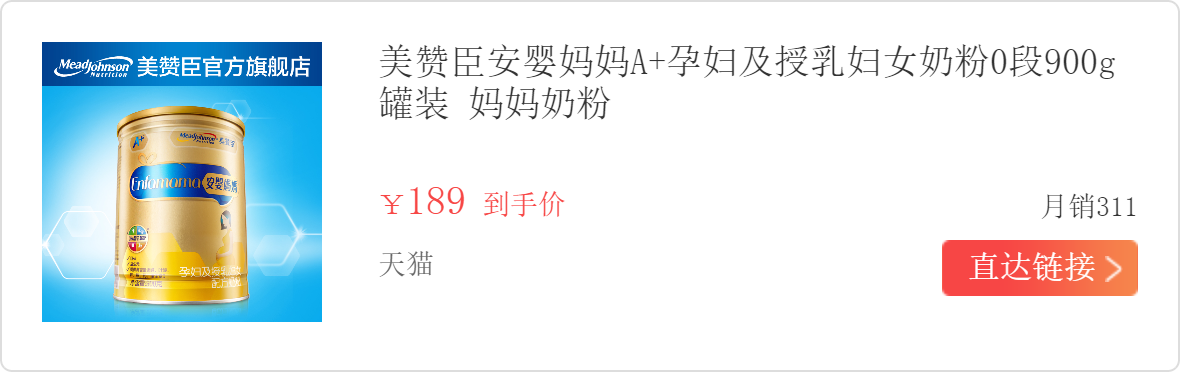 功课做了很久觉得安婴妈妈适合我,毕竟我的需求基本都能满足,还有膳食纤维,但是有说味道太重,我上孩子王溜达一圈,美赞臣专柜送了我一个试用,我回去按说明放了6勺,味道香香的,但是真的香很重,我没孕吐,我可以忍,并且冲泡结块,我搅了半天,还有小块突然觉得自己明智,没买大桶,好像不到200块钱吧,我直接没有图,懒得拍。