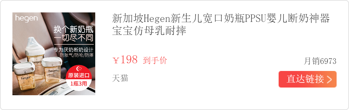 因为个人原因,宝宝出生就是吃奶粉,给她挑选这个奶瓶是新加坡原装进口hegen,其实还买了好几个奶瓶,包括很火的可么多么,还有布朗博士,用下来还是这个最好用,说说优点吧。