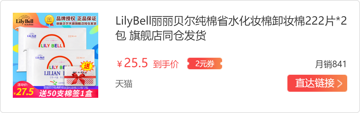 第一个是Lilybell化妆棉,首先要提一下包装,222枚的大包装带有封口的绳子,做的很贴心,一包足足有222片,所以随便怎么用都不心疼;化妆绵虽然厚一些,无纺布表面,中间是棉花,但是不起毛不掉棉絮,适合配合拍爽肤水用,可以吸很多水,拍全脸比较久才干掉。