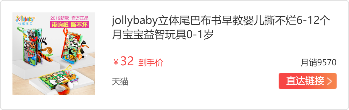 拿到手发现真没让我失望,每一页的设计丰富有趣,做工线头精致牢固,不愧是Jollybaby出品,宝宝刚出生的时候就买了它家好多尾巴布书,绘画风格很有特色,做工严密撕不烂,所以一直对这个品牌很有好感。