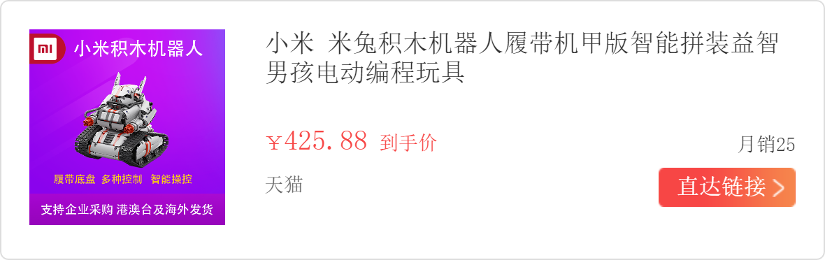 今年给儿子买的最满意的一个玩具就是米兔积木机器人,安利了同事和闺蜜,家里的大人小孩都很喜欢。之前儿子一直是玩乐高的,虽然乐高很好,但我发现小米旗下的米兔积木机器人除了和乐高一样能百变拼插,开发儿子的想象力、动手能力之外,还带有智能控制能变身成为机器人,可以说是男孩子梦寐以求的玩具了。
