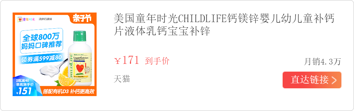 美国childlife童年时光钙镁锌,6个月以上的宝宝到12岁儿童都可以吃,因为橘子酸奶味道,柠檬酸钙吸收特别的好,在整个中国也是最畅销的宝宝液体钙。