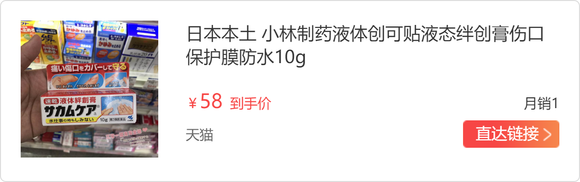小林制药创可贴很多人可能没有听过,但是这是日本最受欢迎的液体创可贴,比起普通创可贴,液体创可贴涂抹后不怕进水,涂抹部位不会因为胶布包扎而发白,膜体紧紧覆盖创面,比普通创可贴提供了更全面的保护。 就算有伤口,洗澡也不用怕了。
