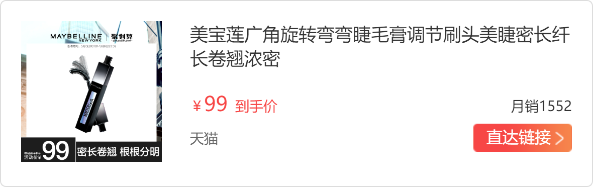 这款睫毛膏在纤长、自然上面,可以说是我最喜欢的睫毛膏了。它刷出来的眼睫毛特别卷翘自然,带妆六七个小时。而且它一点都不结块!完全就像是你自己的睫毛一样好。亮点是它真的不贵!