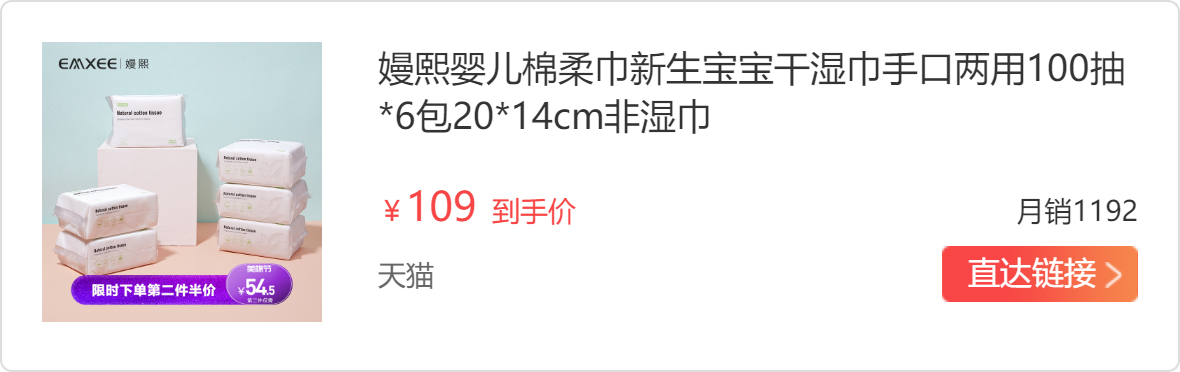 作为一个居家的妈妈我当然要囤了,请教了邻居原来是嫚熙—婴儿棉柔巾,竟然跟我就家宝宝的湿巾是一个牌子的,这下我是真的放心了。