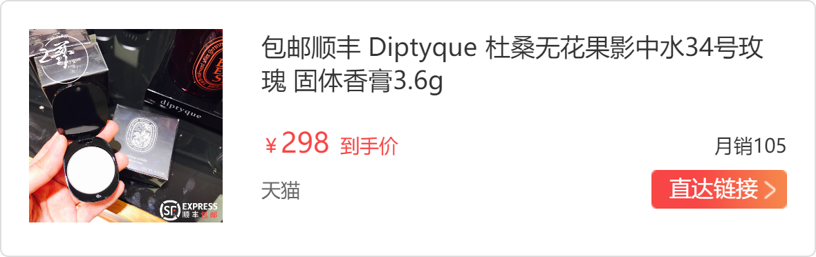 真的超级好闻!!!在此之前都是用祖马龙蓝风铃那款的香水,但是有了Diptyque以后都不想理祖玛珑了,嘻嘻。这是一个很温润的味道,闻起来特别开心,不过香膏觉得有点不经用,一个月用的已经基本见底了。