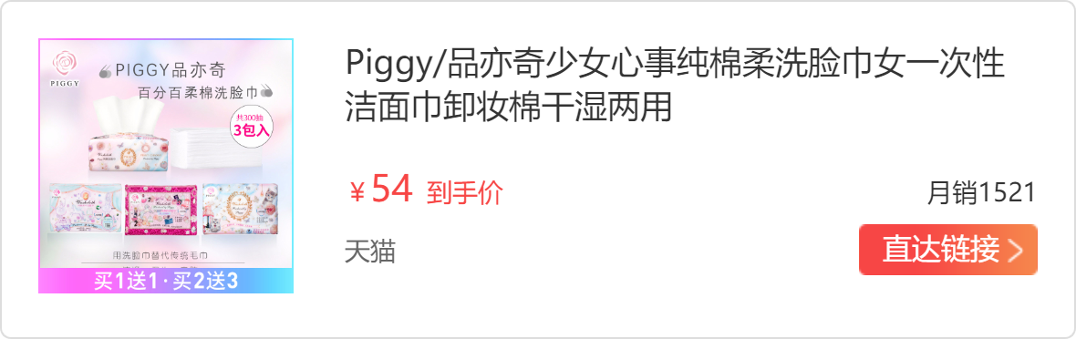 Piggy家的洗脸巾是我用过这么多牌子中我最爱说一款了,而且它家的包装也太太太少女心了吧,完全取向阻击啊!!超可爱的猫咪、芭蕾女孩、爱上巴黎款印在上面,看着心情就很美丽~
