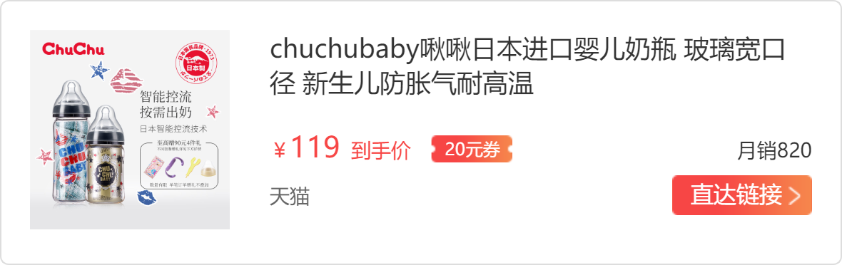 因为奶水比较少,所以打算混合喂养,之前用的那款奶瓶宝宝一吃奶总是呛到,最近想着给宝宝换一个奶瓶,总找不到合适的,闺蜜给我推荐了日本100%原装进口的奶瓶,决定给我家宝宝试一试。