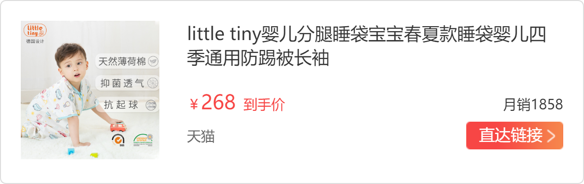 一岁半入了littletiny的夏天薄荷睡袋,替代了小时候的家居服,薄荷材质超级舒服,不得不说littletiny在研究宝宝用品上还是很用心的,不起球还透气,夏天穿这种两层的很舒服。