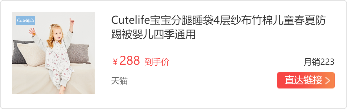 Cutelife竹节棉婴儿睡袋,不论两宝怎么翻动,它都可以把身子牢牢实实盖住。这款婴儿睡袋采用竹节棉材质,比普通棉花更透气更吸汗,虽然有人说cutelife睡袋拉链掉漆,但是我家的并没有啊。