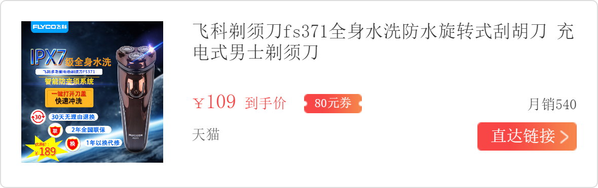 飞科的剃须刀感觉好多年包装都没换过啦,藏蓝底色配白色字体,显得比较醒目。这次购买的FS371+,喜欢全身水洗功能和三头剃须设计。
