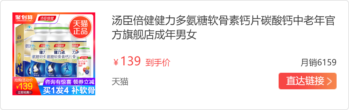 听网上的友友说汤臣倍健健力多氨糖软骨素钙片很多老爸老妈都在用,而且也很管用,就买来给老豆试了下。最重要的是性价比还蛮高的,一瓶也不贵!