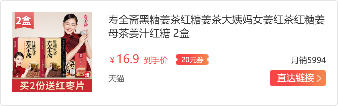 那时候不懂喝红糖姜茶可以缓解痛经,后面看到小s做节目介绍说喝红糖水可以暖宫治痛经,推荐了一款自己代言的“寿全斋红糖姜茶”,自己也上网了解了下,这是一个百年老品牌,旗舰店买的39两盒,很多网友评价都是不错,赶紧试试。
