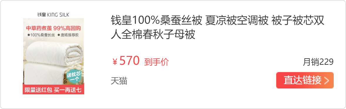 自从生了宝宝以后自己对于生活用品的需求也更加的高了,不知道宝妈们有没有跟我一样的情况,总感觉生完宝宝以后,身体的免疫力也下降了。夏天要来了,总想选择一款舒适一些的被子,生完宝宝自己也很辛苦的,想要对自己更好一些。后来我选择了这款唐嫣代言的钱皇蚕丝被。