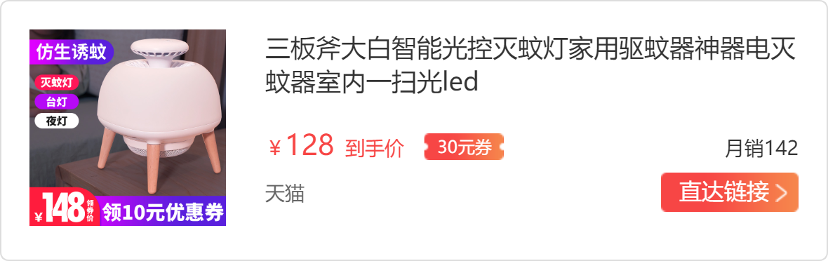 入的三板斧小白灭蚊灯,小巧颜值高,看中三合一功能(灭蚊/台灯/夜灯自由切换)实用型强,工作原理是紫光仿生灭蚊,利用蚊子的趋光性,将其吸引过来并捕获!