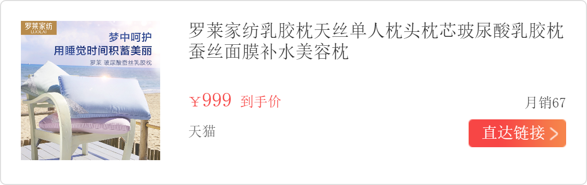 罗莱家纺的玻尿酸蚕丝乳胶枕,直接锁了好吧,每个爱美的小姐姐都值得拥有。平时睡觉为什么不喜欢枕头呢,因为睡前做好的护肤步骤,整张脸都充斥着人民币的味道。睡觉一摊在枕头上全蹭了上去,这?有时候怀疑枕头比我的皮肤还要好,毕竟每天都吸收了我脸上昂贵的护肤品。