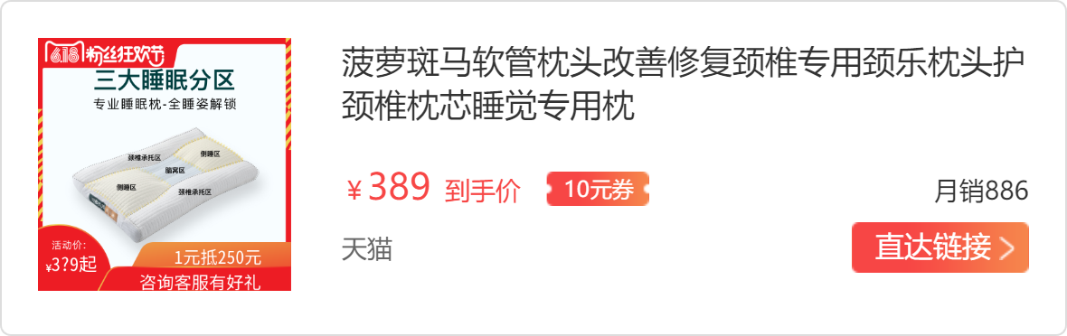 我最近试用的的菠萝斑马颈乐枕真的爱了,颈椎的疼痛真的有缓解,脖子也没有之前那么这么酸了,而且睡眠质量也提高了很多,睡的好感觉压力也少了很多,哈哈哈。拿到枕头以后,我一个学设计的,都感觉这个设计很人性化,睡眠分区做的很贴心,仰睡、侧睡各有专门的区域,不论侧睡还是仰睡都能使得颈椎被承托起来,处于放松状态。