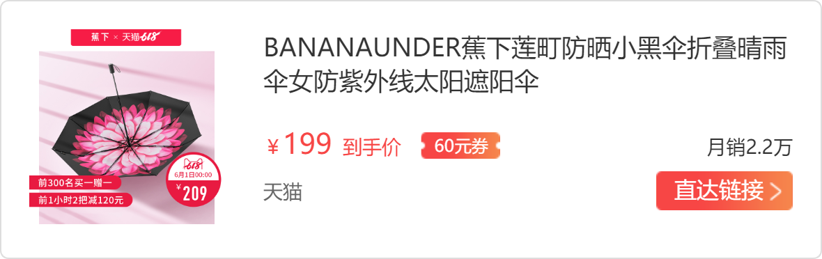 蕉下防晒伞的伞布包裹L.R.C黑胶涂层、可以阻挡隔离99%以上的紫外线属于蕉下的专利技术,这才是防晒伞的重点、可不可以真的防晒!拿雨伞去防晒的亲们赶紧醒醒吧、我都替你们着急、那紫外线伤害的都是自己的脸呀、干嘛省那么几十块钱跟自己美貌过不去呢~