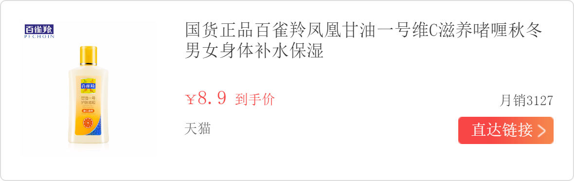 百雀羚甘油用了好多年了,每次梅雨季节,湿气较重的天气,我都用来擦手擦身体!超市几元一大瓶,用后皮肤水润润的,特别适合干皮和沙漠皮!