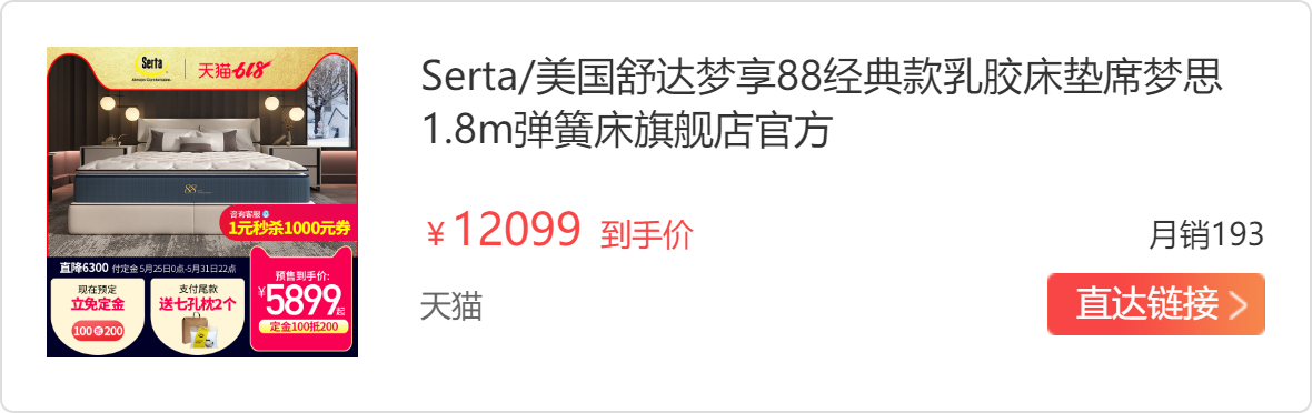 全球公认的好床垫也就那么几家,最近看了很多品牌的床垫,最后聚焦在丝涟和舒达两个品牌的床垫上做选择。经过一番对比,舒达梦享88尊享版深得我意,采用独立袋装技术,保证睡觉时互不干扰。