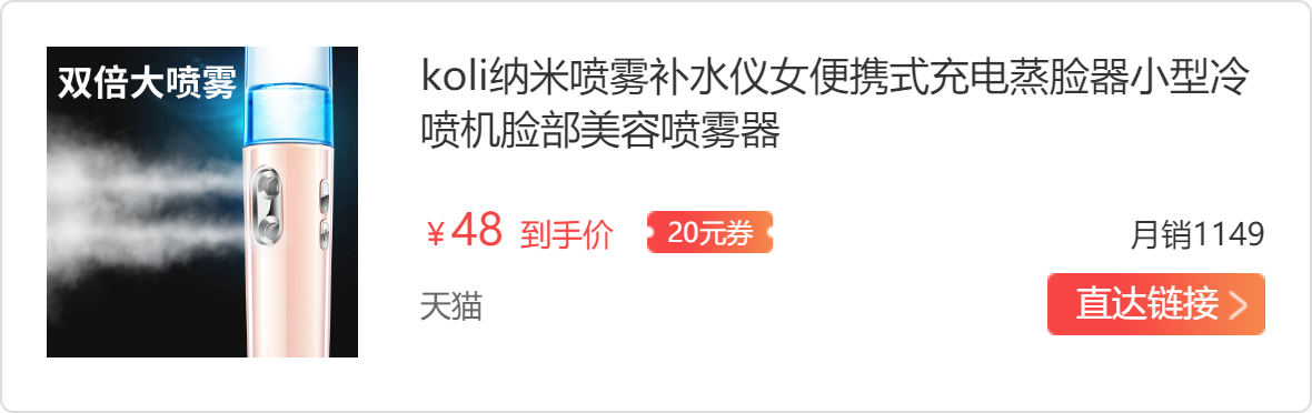 我一般都会坚持使用喷雾补水仪,家里放一个家用的,平时出门随身携带这个koli纳米喷雾补水仪,很小巧,放在包里超级方便。充电一次,能用三小时,有专门的储藏布袋,不怕放包里被磨损。这款补水仪用起来超级简单,打开水箱,装入适合你皮肤的矿泉水(说明书里有详细的介绍)打开开关,路灯亮表示工作,一秒就出来喷雾。拿在手里,想补哪里就喷哪里!so easy!