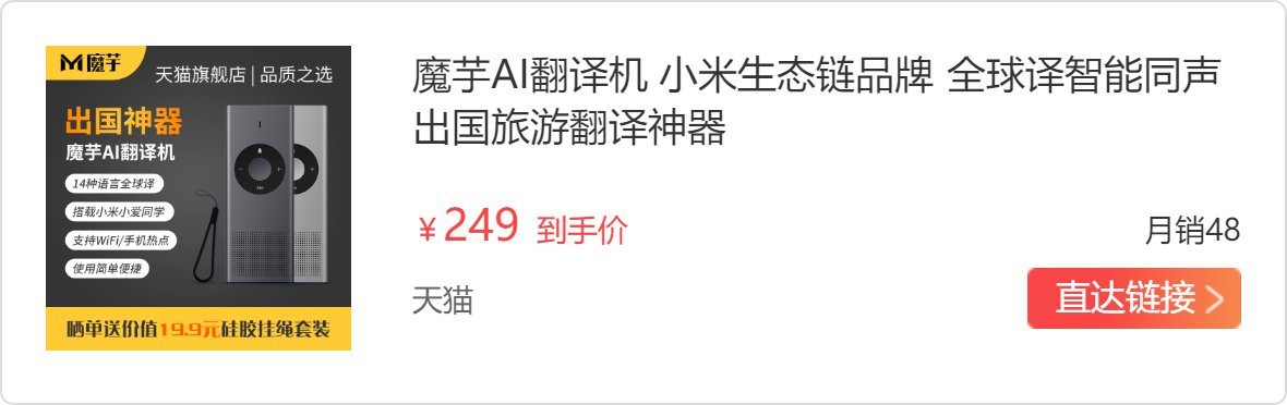 今年暑假准备去日本大阪7天6夜,近期正在做攻略,然后就刷到米家有品新上线一款魔芋AI翻译机,仅249元,相比讯飞的那个2999元的2.0版的翻译机来说,这个价格连十分之一都不到。就是不知道他的功能和实际使用怎么样,于是看在249元的低价,撸了一个。