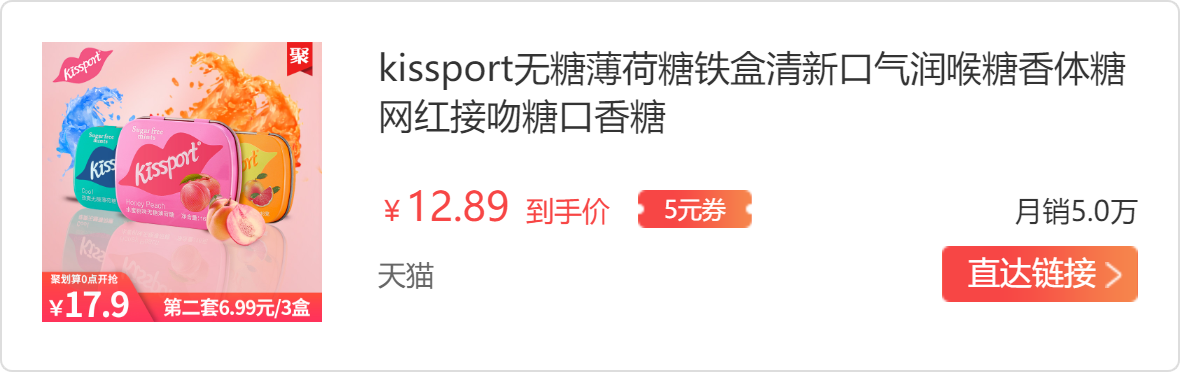 第1款,kissport口香糖,小编觉得,口香糖是个好东西,在咀嚼口香糖的时候,不仅可以满足我们对食物的需求,还不用担心会摄入过多的热量,另外,口香糖还能起到清新口气的作用,吃起来也很文雅。