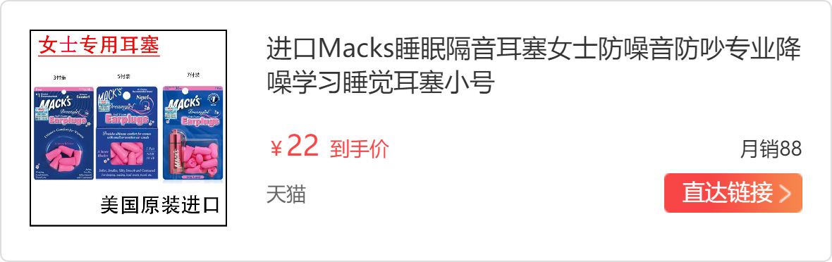 也就是前两天吧,我舍友给了我一对耳塞,看盒子好像是MACK’s的dreamgirl耳塞,虽然名字没听说过,但上网查了一下,知名度还可以,是个美国牌子。这个耳塞真的深得我心,尤其是大小,塞我这种小耳道刚刚好,不会觉得胀疼,隔音效果也是刚刚好,晚上再也没被吵醒过。室友那时候说她还要下单,我就让她帮我也带了一盒。真的价格不贵,而且数量很多。