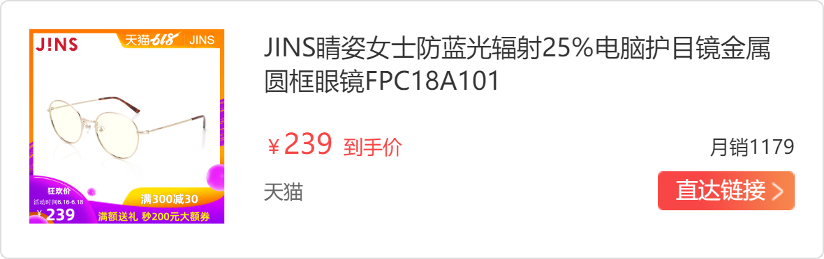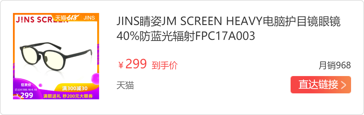 我是比较养生的人,对眼睛的保护也非常注重,所以我总是想买一款防蓝光眼睛,用来保护自己的眼睛。我买的是jins防蓝光眼镜,jins防蓝光眼镜根据人们的不同使用场合设计了不同蓝光遮挡率的防蓝光眼镜,这一点真的很人性化。
