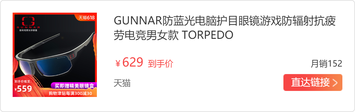 很早之前我就买了一副gunnar防蓝光眼镜,当时看中了这款眼镜防蓝光,并且有相关的设计和技术,很多电竞大神都在用,看起来就非常专业。当时就入手了一款Vayper,戴的眼睛很舒服。但是镜架部分有些设计比较不好。于是,在GUNNAR新款发售的时候,我又入手了一款,嘿嘿。我们一起来看看GUNNAR的2019年新款TORPEDO,职业玩家的选择!
