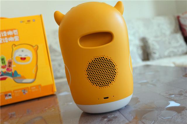 读书牛的外观造型非常像一直呆萌的卡通牛,两个小小的牛角,颜色采用黄白色搭配,重要的是外壳为ABS食品级材质,无惧孩子啃咬,正面为一个屏幕,屏幕上方位一颗摄像头,用于绘本文字的识别,围绕屏幕有三颗MIC孔,背侧设计了一个提手,3W喇叭,喇叭下方位micro-usb充电口,分列充电口左侧的两个小孔分别为电源提示灯和RESET孔。