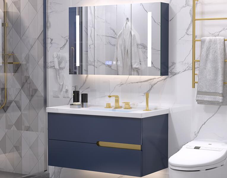 ★星空灰浴室柜采用创新熠金油漆工艺,配合金色铝合金拉手,轻奢简雅