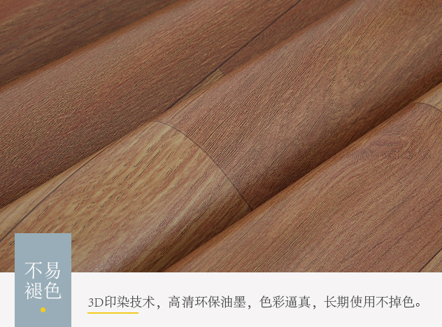 选用孕妇和婴儿都能接受的环保材料,环保健康,呵护您和家人健康,采用精湛的3D印染高清油墨,木纹纹理清晰可见均匀饱满,触感光滑。地板革哑光磨砂PVC耐磨表层,使用寿命长,清晰木纹纹理,光滑的表面。表面UV层和PVC耐磨层防护,可以直接隔离水流,防水防潮,无惧回南天,满足家居日常需求。表面UV层主要成分是树脂粉和大理粉阻燃效果好,阻燃不自燃,不怕烟火安全更放心。E1级标准,易清洁,方便实用;3D印染技术,高清环保油墨,色彩逼真,长期使用不掉色。与地面更服帖(环保树脂粉、使地板展平度更高,抓地力更强,久用以后依然不起皱)。选用无染色加厚纤维棉丝,无任何添加剂和染色剂,长期使用不生虫。五层加厚地板革,降噪隔音,绿色环保,不影响家居娱乐。水泥地也能用,平整贴合地面,安装便捷简单更省心。