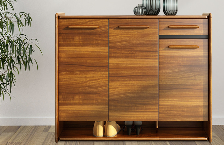 门厅柜六层储鞋层设计,层板可调节高度,满足各种高度鞋靴需求,采用E1级免漆中纤板,冲压印纹技术,颜色纯真,木纹自然。鞋柜框架及拉手均选用进口橡胶实木,坚固结实,使用寿命长。