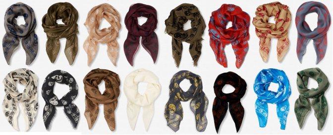 鬼才设计师Alexander McQueen的同名品牌极有他的个人色彩,乖张出挑,运用大量摇滚和朋克元素,以天马行空的创造力赋予品牌戏剧性的张力,骷髅图案的围巾也成为品牌的标志性作品之一,价位在千元左右。