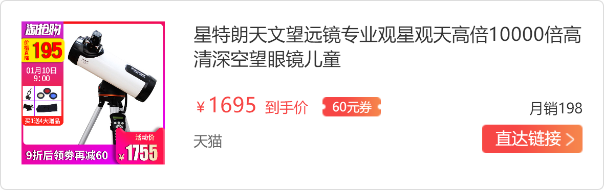 星特朗起源于美国,建立于上世纪50年代,星特朗在各个价位都有非常优秀的产品,百元级的PowerSeeker 50AZ,对新手非常友好,安装不需要任何工具,镜头组件采用全表面镀膜,而且天文地景两用,以300元的价格来说,性价比非常高。到千元级,可以选择DX80EQ,保有量很大,镜片多层镀绿膜,观月的边缘很清晰,色差非常小,全正像天顶镜,天文地景两用,900元以下有交易,不过EQ2赤道仪没有标配电动马达,加配EQ2的电动跟踪马达需要450元,整套下来就在1400元左右了。
