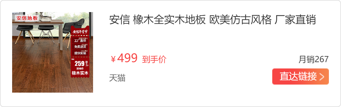 安信木地板有用过的朋友应该知道的,纹理很自然,颜色比较厚重,上色效果好,而且味道不刺鼻,很清新,地板本身质量还可以,在二线中算是相当可以的了,耐磨性不是太令人满意,比较容易磨损,所以要经常注意保养,防水性也是一般,算不上多好的质量,价格中规中矩,从地板槽口和边角上看,打磨的还是很精细的,平时多注意一些的话,使用上还OK。