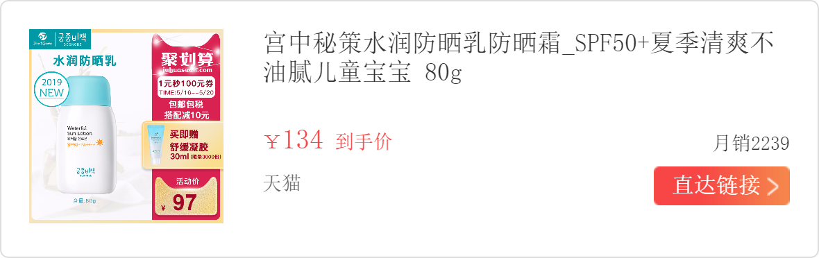 对于干皮敏感肌的我来说宫中秘策儿童防晒霜简直是大爱好不好,激光祛斑五次了,对于新长出来的皮肤,简直比对待婴儿的脸还要重视,所以当时挑来挑去还是选择了宫中秘策宝宝防晒霜,毕竟是专门用来宝宝防晒的,没有什么刺激性,而且涂宫中秘策儿童防晒霜都不需要专门卸妆水卸妆,直接温水就可以洗干净了,可以说很有安全感了。出门放包包里,也就巴掌那么大,敏感肌随便入。