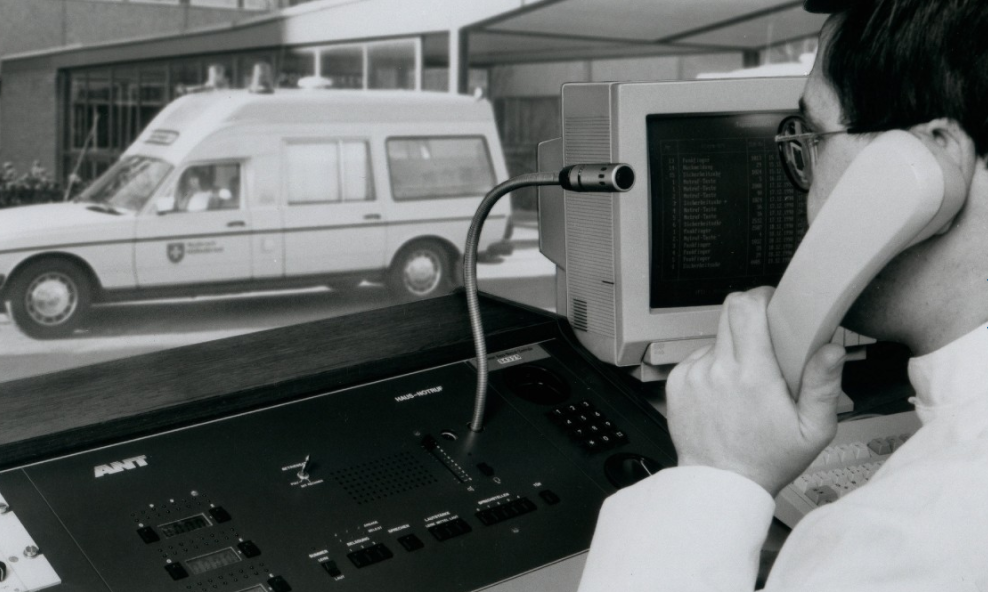 Bosch电信紧急呼叫中心(1991年)。Bosch通过收购Telenorma AG和ANT GmbH,成为20世纪80年代领先的电信供应商之一。