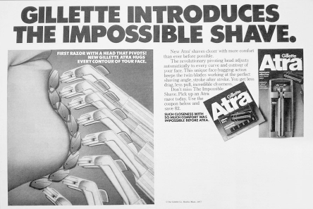 吉列引入了Atra/Cont our系统,这是第一款具有旋转刀头的双刀片剃须刀架,它能够使刀片更好地适应面部轮廓,剃须时更加贴合。