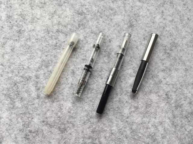 百乐的上墨用具,由左至右分别是:墨胆、旋转上墨器 CON-40、旋转上墨器 CON-50、挤压上墨器 CON-20。