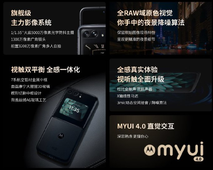 影像方面,moto razr 2022 前置 3200 万像素自拍摄像头,后置 5000 万像素主摄(豪威 OV50A,1/1.55",OIS)+1300 万像素超广角。